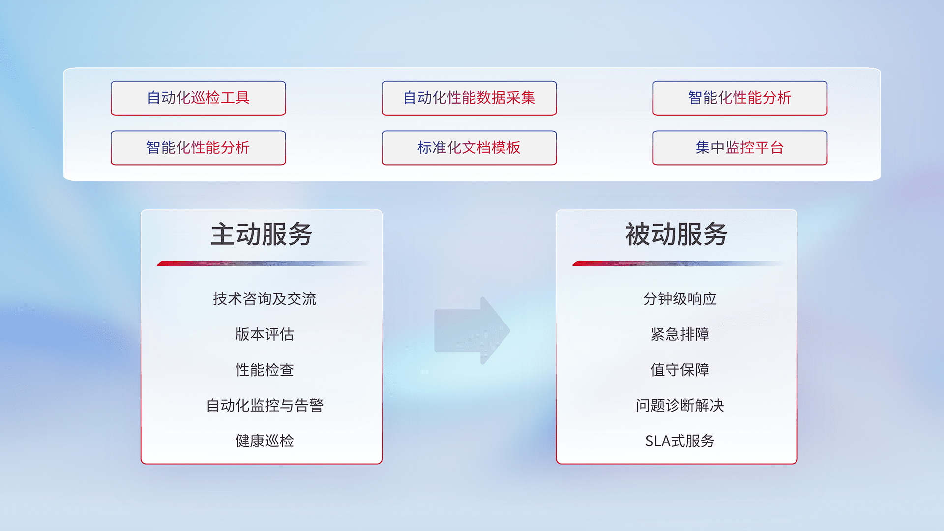 智能化工具和标准化文档,,,保障服务质量,,提供主动服务(包含技术咨询、、、版本评估、、、性能检查、、、自动化监控与告警、、健康巡检)和被动服务包含(分钟级响应、、紧急排障、、、、值守保障、、、问题诊断解决、、SLA服务)。。。。